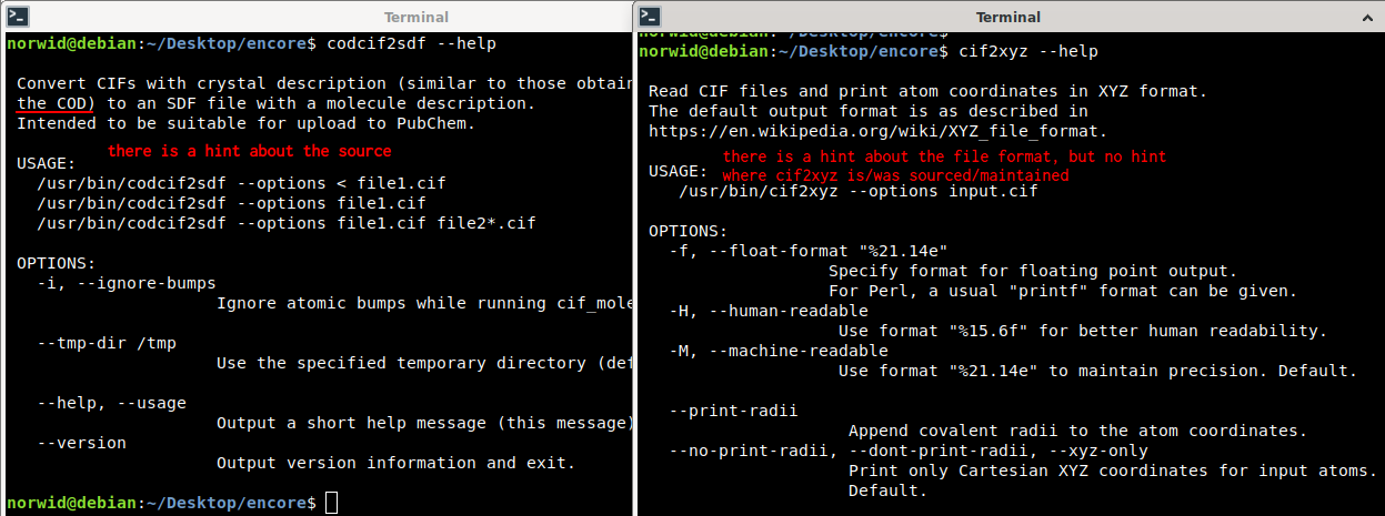 in contrast to e.g. calling --help for codcif2sdf, neither the name of the