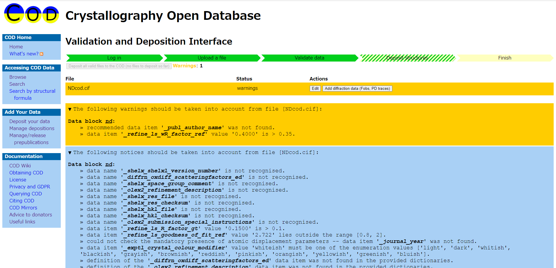I am currently trying to deposit the microED crystal structure of an organic compound onto COD.
